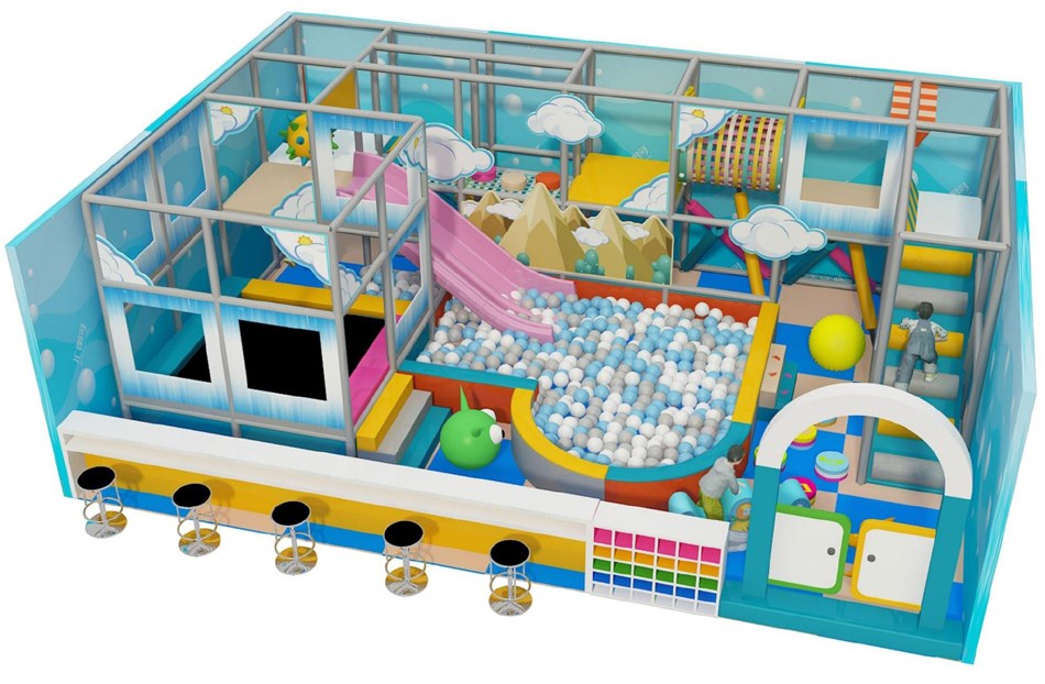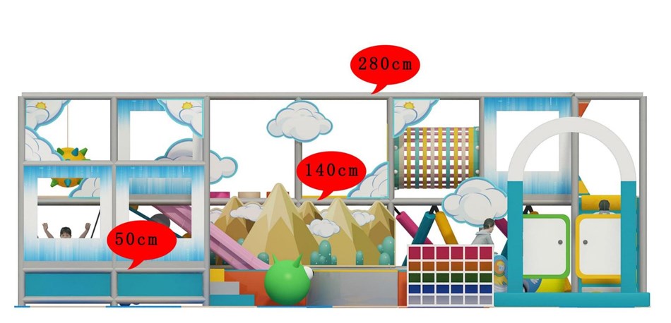 Khu vui chơi liên hoàn trong nhà với kích thước xấp xỉ 8.42m x 5.97m là một giải pháp thiết kế tối ưu, tích hợp nhiều trò chơi đa dạng như nhà banh, trampoline và cầu trượt. Với chủ đề "Bầu Trời Mây" tươi sáng và thiết kế hai tầng thông minh, đây là một mô hình đầu tư hiệu quả, hứa hẹn trở thành điểm đến lý tưởng, mang lại niềm vui và sự phát triển toàn diện cho trẻ em.