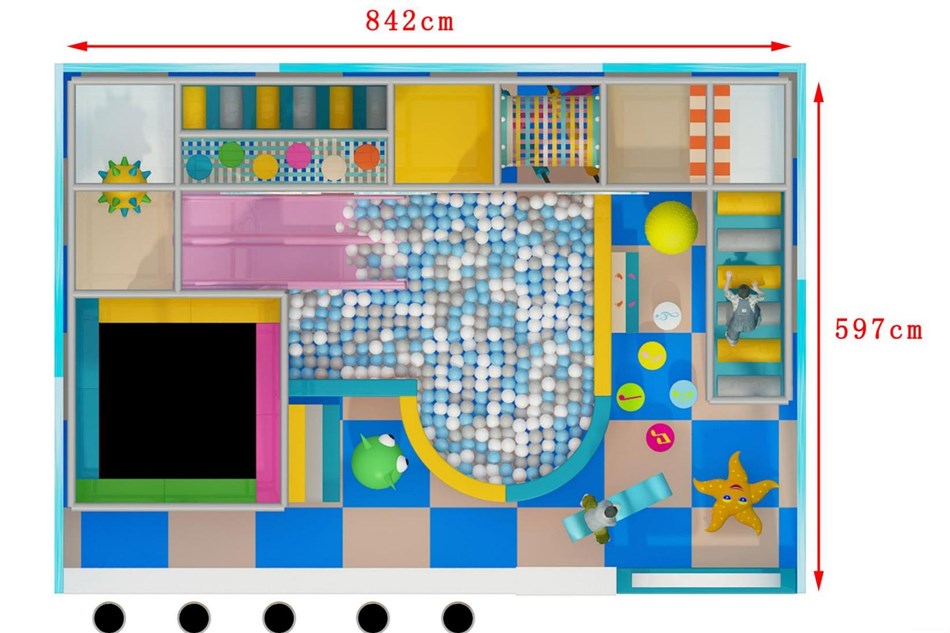 Khu vui chơi liên hoàn (Soft Play/Indoor Playground) là mô hình giải trí được thiết kế khép kín, an toàn và đa dạng trò chơi, đặc biệt phù hợp với trẻ em ở nhiều độ tuổi khác nhau. Dựa trên hình ảnh mặt bằng và thiết kế 3D, chúng ta có một khu vui chơi trong nhà ấn tượng với kích thước xấp xỉ 8.42mchiều dài và 5.97 m chiều rộng, tạo ra tổng diện tích khoảng 50.2 m. Chiều cao của khu vực chính được thiết kế hai tầng, với tầng cao nhất đạt 2,8m, đủ không gian cho các bé thỏa sức khám phá.