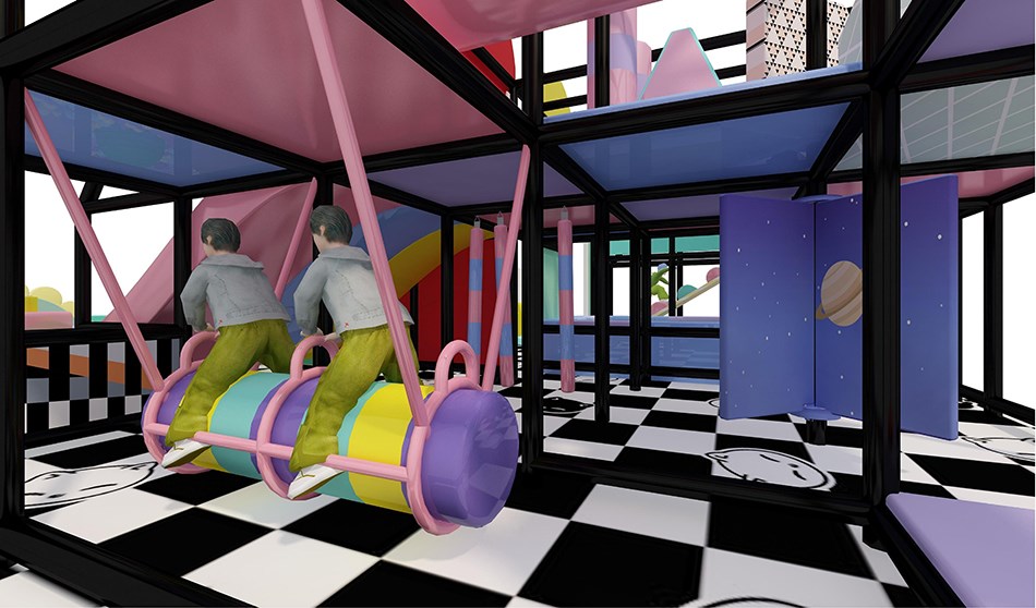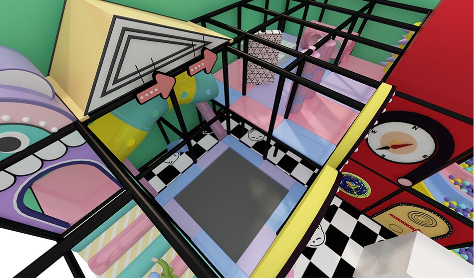 Sàn nhà: Khu vực chính phía dưới cấu trúc liên hoàn và khu xích đu sử dụng sàn chống trượt với họa tiết ô vuông đen trắng cổ điển, xen kẽ các hình vẽ khuôn mặt hoạt hình, tạo sự tương phản mạnh mẽ và cá tính.