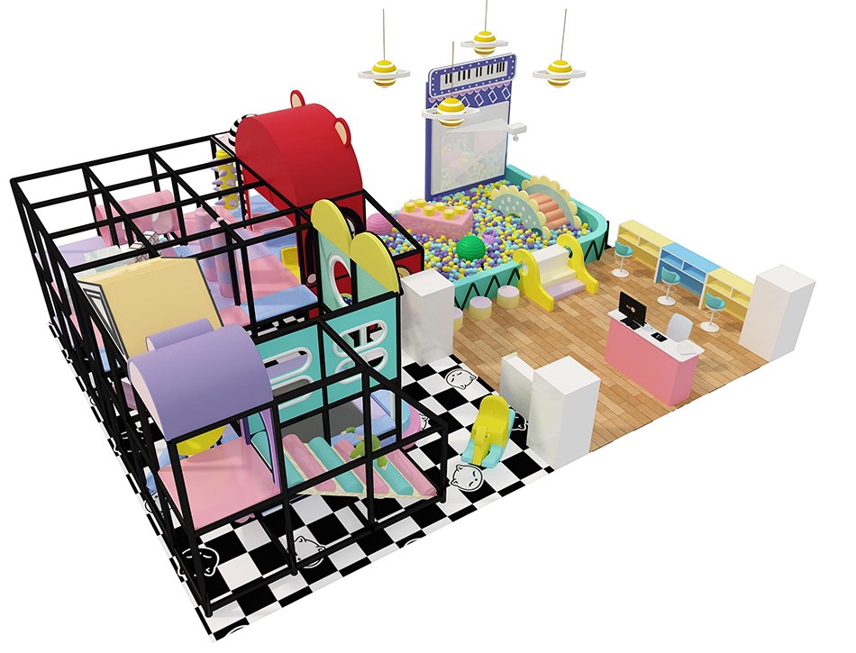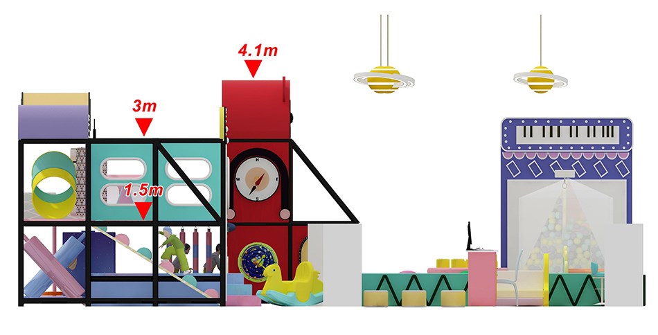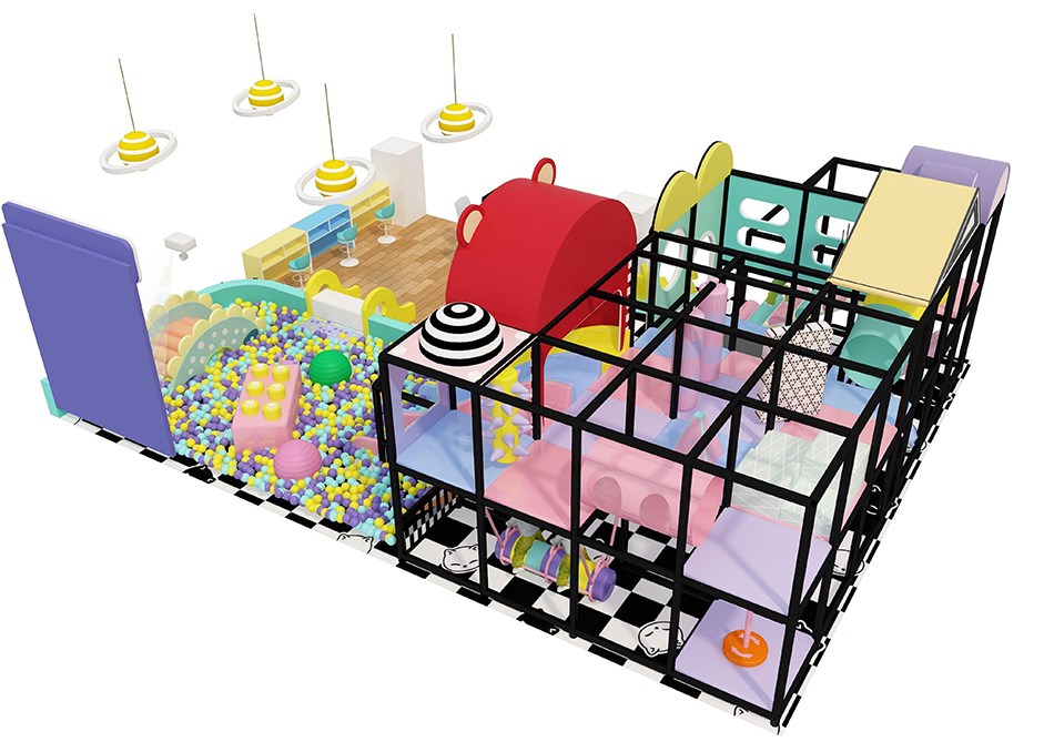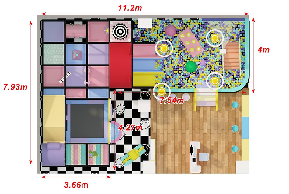 Khu vui chơi liên hoàn GN1002 đại diện cho một mô hình giải trí hiện đại, tối ưu hóa không gian cho các địa điểm thương mại lớn như trung tâm thương mại hoặc các khu giải trí chuyên biệt. Dựa trên bản vẽ mặt bằng, khu vui chơi này có kích thước ấn tượng: chiều dài 11,2m x7,93m, tạo ra tổng diện tích khoảng 89m2.