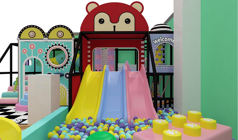 Nổi bật là ba làn cầu trượt nhỏ màu vàng, xanh dương, hồng, được thiết kế dưới hình ảnh đầu chú gấu đỏ ngộ nghĩnh.