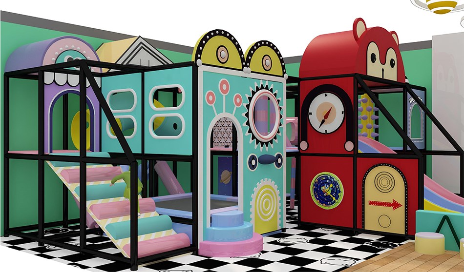 Cấu trúc liên hoàn được trang trí bằng các khối hình học lớn, họa tiết hoạt hình, và các chi tiết như la bàn, bánh răng, tạo cảm giác như lạc vào một thị trấn hoạt hình độc đáo.