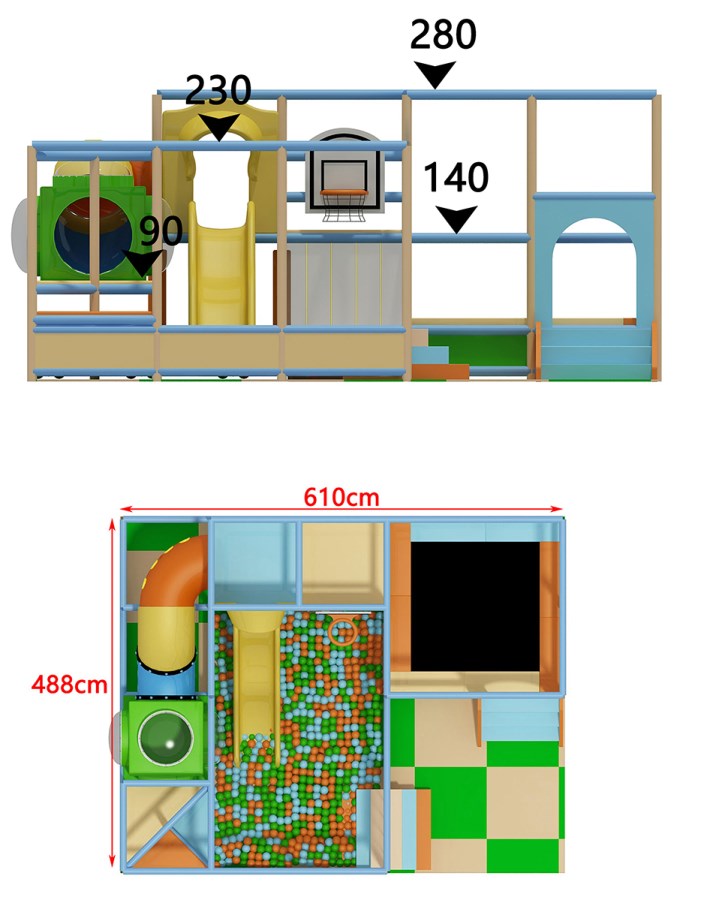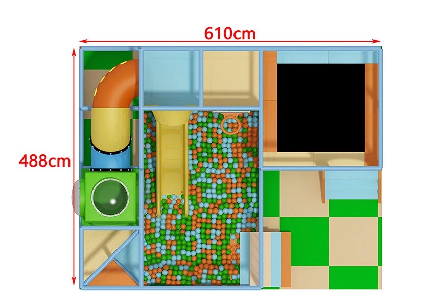 Khu vui chơi liên hoàn GN1003 là một giải pháp thiết kế thông minh, tối ưu hóa không gian, đặc biệt phù hợp cho các nhà đầu tư có diện tích mặt bằng hạn chế như quán cà phê, nhà hàng, khu vực sinh hoạt cộng đồng nhỏ hoặc các cửa hàng tiện lợi. Dựa trên bản vẽ mặt bằng, khu vui chơi này có kích thước gọn gàng: chiều dài 6,1m và 4,88m, tạo ra tổng diện tích khoảng 29,8m2