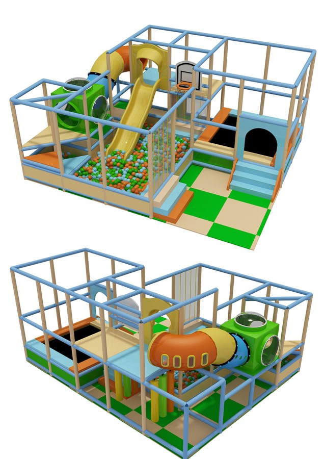 Màu sắc chủ đạo: Kết hợp giữa tông màu pastel như xanh dương nhạt (khung), màu be/kem (sàn), cùng với các điểm nhấn rực rỡ như vàng chanh (cầu trượt), cam (ống chui) và xanh lá cây (thảm sàn, bóng).