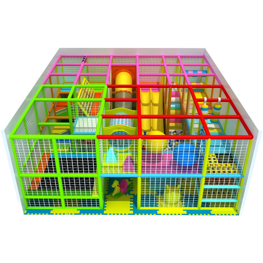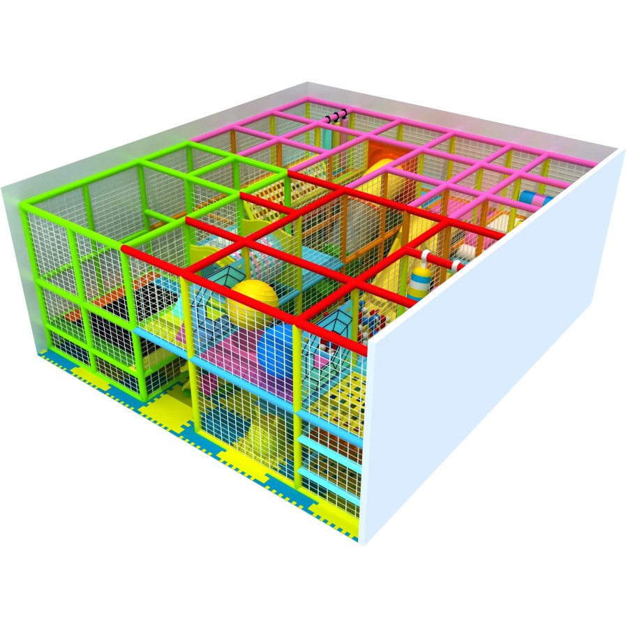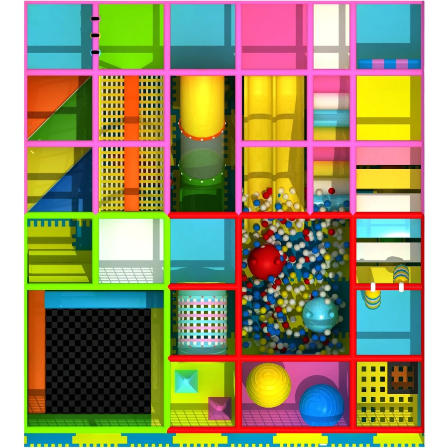 Khung Kết Cấu: Cấu trúc chính là hệ thống khung thép bọc đệm mút màu hồng, xanh lá cây và đỏ, được bao quanh bởi lưới bảo vệ chắc chắn. Sự phân chia màu sắc của khung giúp phân tách trực quan các khu vực chơi chính.