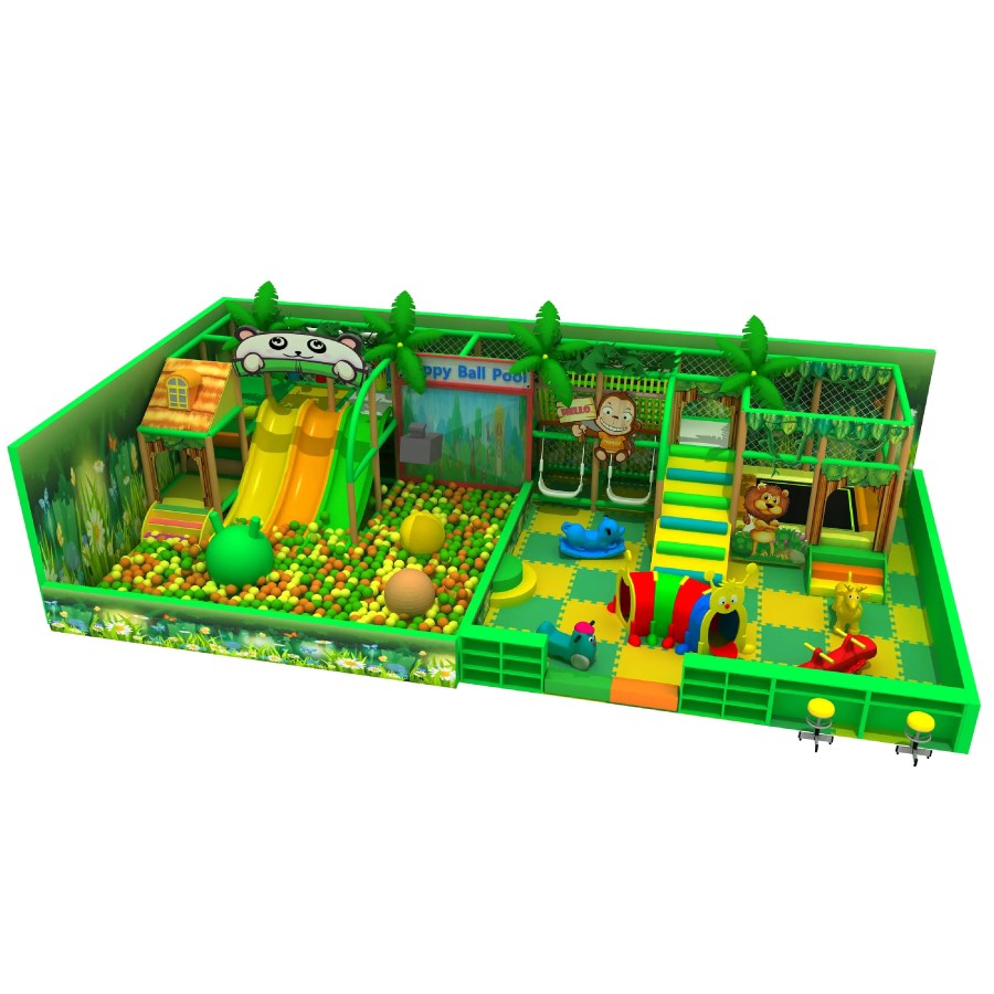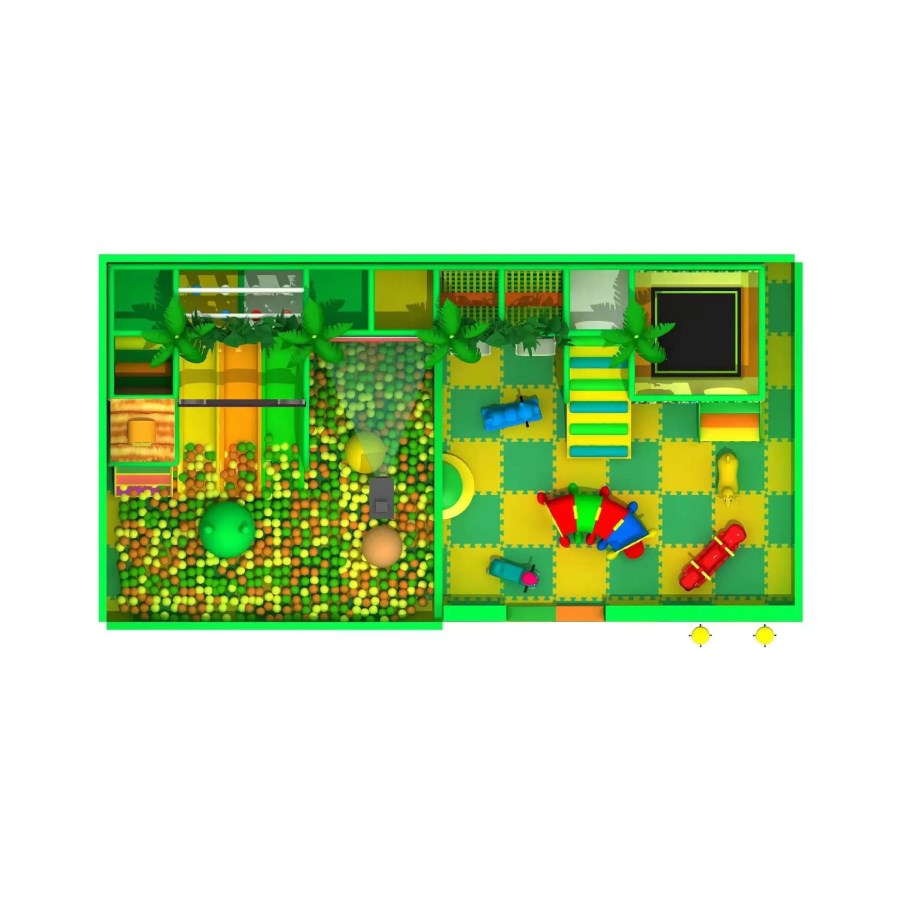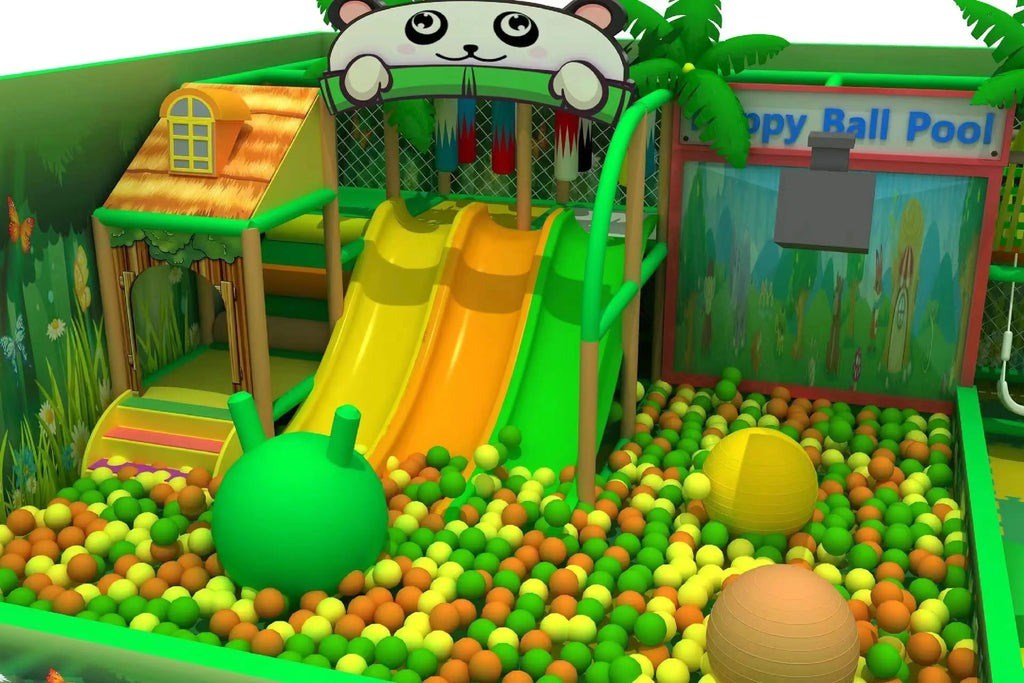 Chủ đề Rừng Xanh: Toàn bộ khu vui chơi được bao phủ bởi màu xanh lá cây rực rỡ, từ khung lưới bảo vệ đến thảm sàn. Các chi tiết trang trí như cây cọ giả được đặt ở trung tâm và các góc, cùng với các họa tiết động vật dễ thương (như gấu trúc, sư tử, khỉ) tạo nên một không gian rừng rậm sinh động.