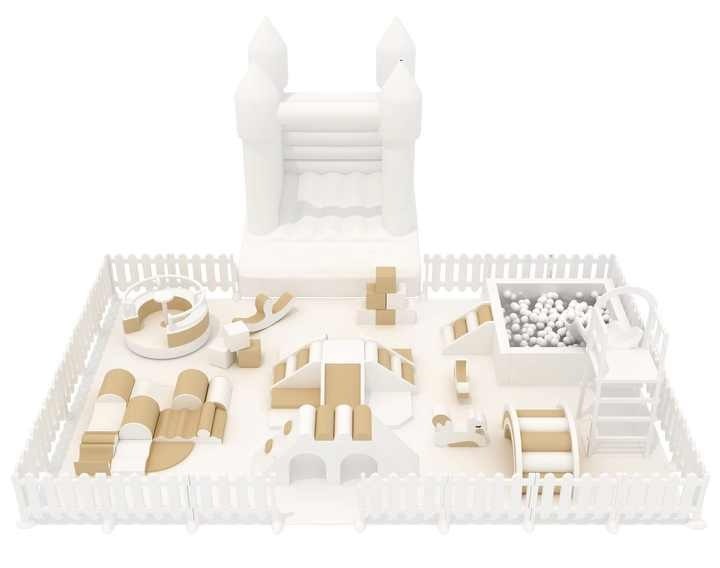 An Toàn Thiết Kế: Khu chơi được bao quanh hoàn toàn bằng hàng rào nhựa màu Trắng. Tất cả thiết bị đều là xốp mềm bọc da PVC, đảm bảo không góc cạnh và an toàn cho làn da nhạy cảm của trẻ.